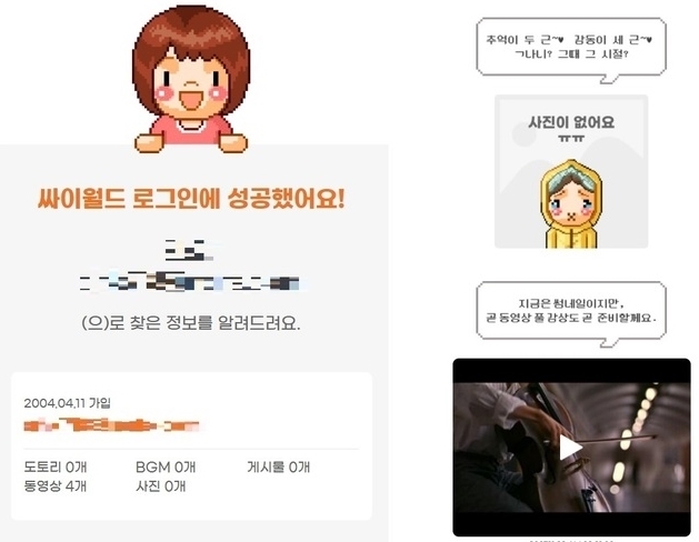 주요 키워드: 싸이월드 로그인, 회원가입, 계정 관리, 미니홈피, 비밀번호, 아이디 찾기, 패스워드 찾기, 재로그인, 복귀, 서비스 업데이트