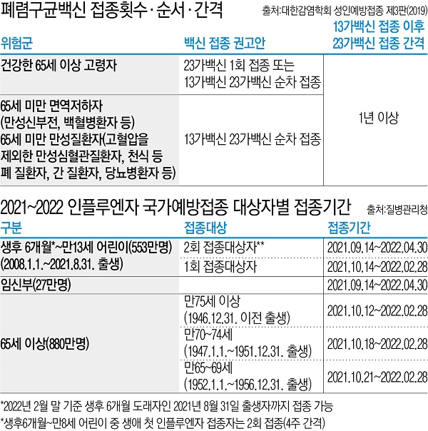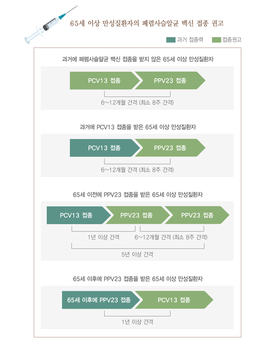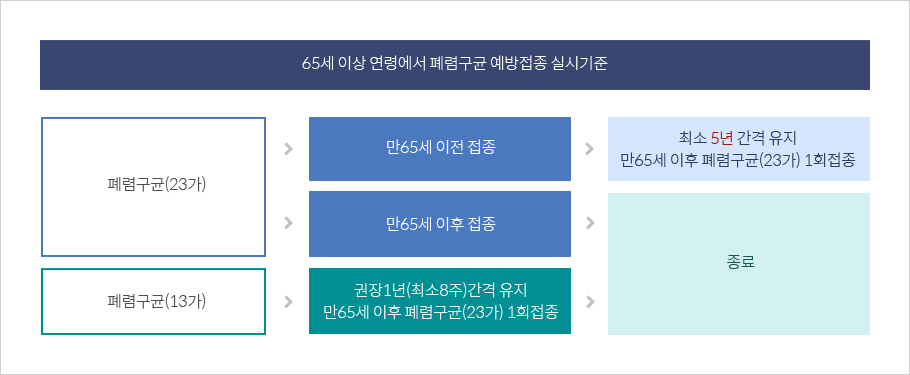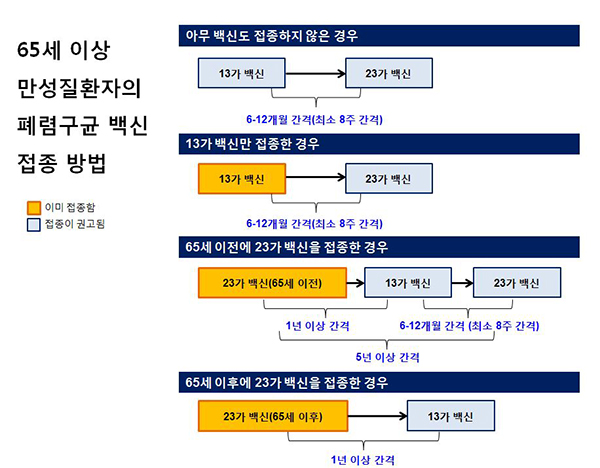 - 성인과 노인의 접종 시기: 65세 이상의 성인과 만성 질환이 있는 성인은 23가 백신을 접종하는 것이 권장됩니다. 또한, 고위험군에 속하는 사람들은 13가 백신과 23가 백신을 함께 접종할 수 있습니다. 보통 1회 접종 후 5년마다 재접종이 필요합니다.