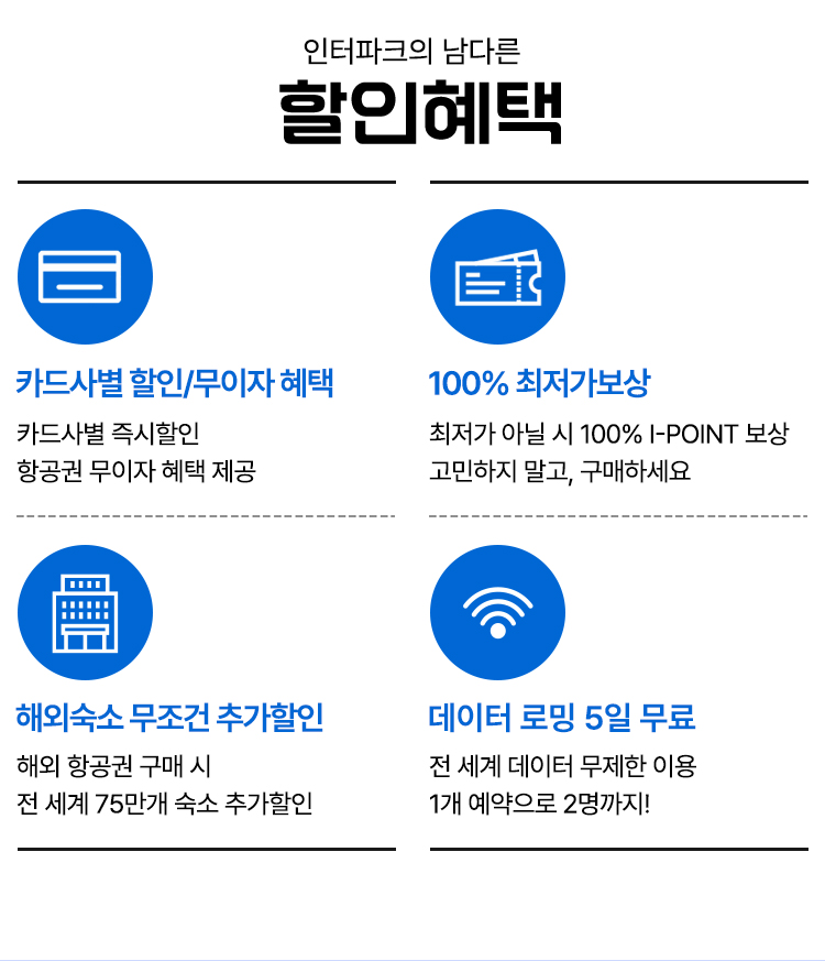 - 다양한 할인 혜택: 인터파크에서는 시즌별, 특정 항공사, 그리고 제휴 카드 할인 등 여러 가지 인터파크 항공권 최저가 구매방법을 통해 소비자들에게 경쟁력 있는 가격을 제공합니다.